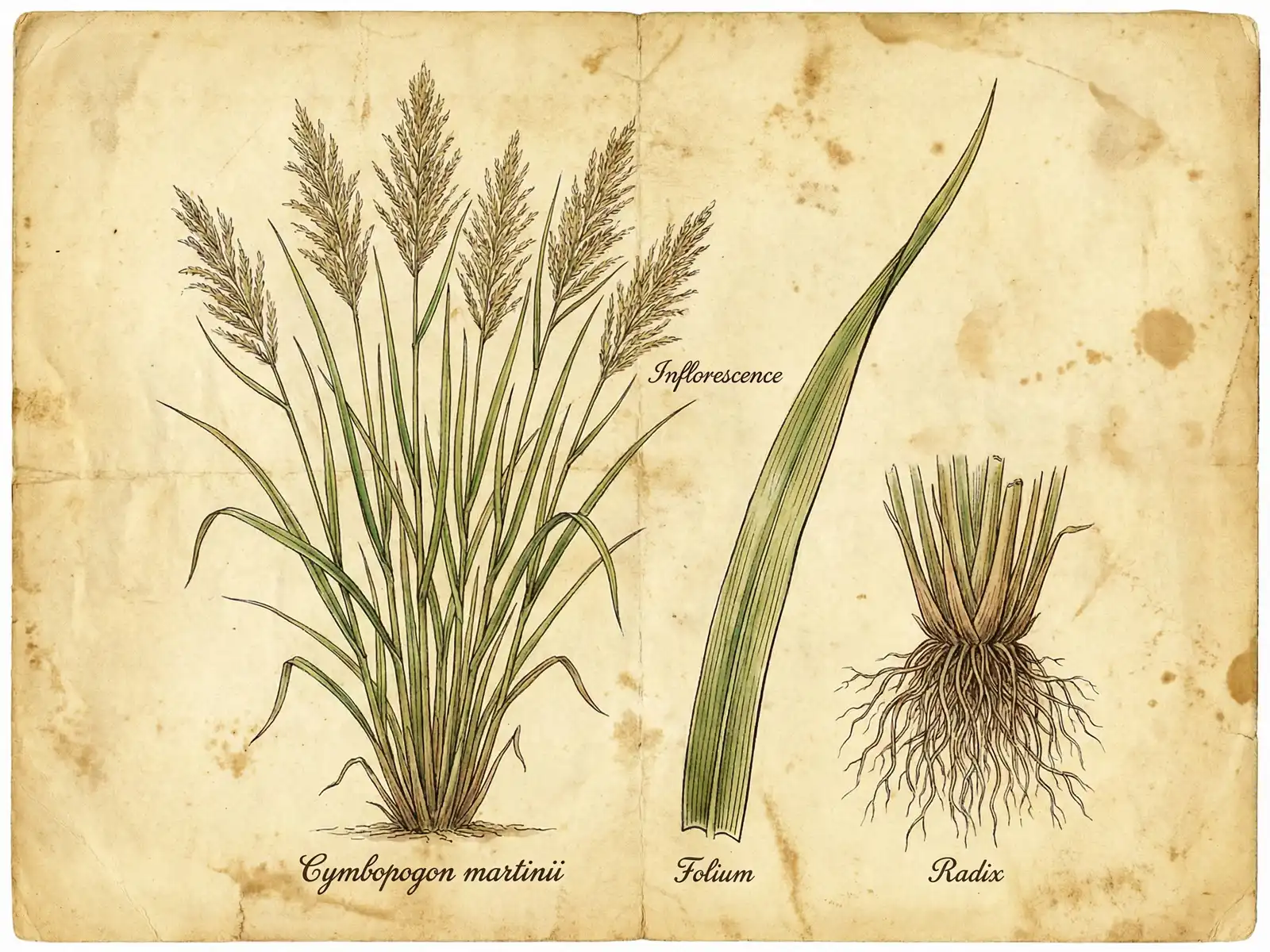 玫瑰草(Palmarosa),又被稱為「印度天竺葵」,雖然名字裡有「玫瑰」,但它其實是一種高大的草本植物。在過去,它常被商人用來冒充或摻雜昂貴的玫瑰精油,因為它含有高比例的牻牛兒醇——這也是玫瑰精油中帶來甜美香氣和護膚功效的核心成分。這份「與玫瑰神似」的特質,也讓它承載了愛、溫柔與美麗的療癒能量。